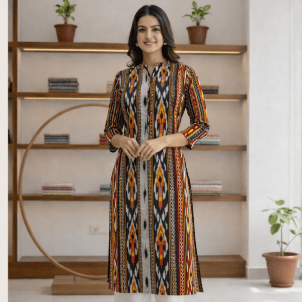 Elevate your wardrobe with this multicolor printed kurti, designed to combine comfort and elegance. Made from soft, breathable fabric, it offers a relaxed fit suitable for all-day wear. The three-quarter sleeves and classic neckline enhance its traditional charm, while the bold, vibrant prints create a standout look. Pair it with palazzos, leggings, or trousers for a versatile outfit perfect for casual outings, work, or festive gatherings.