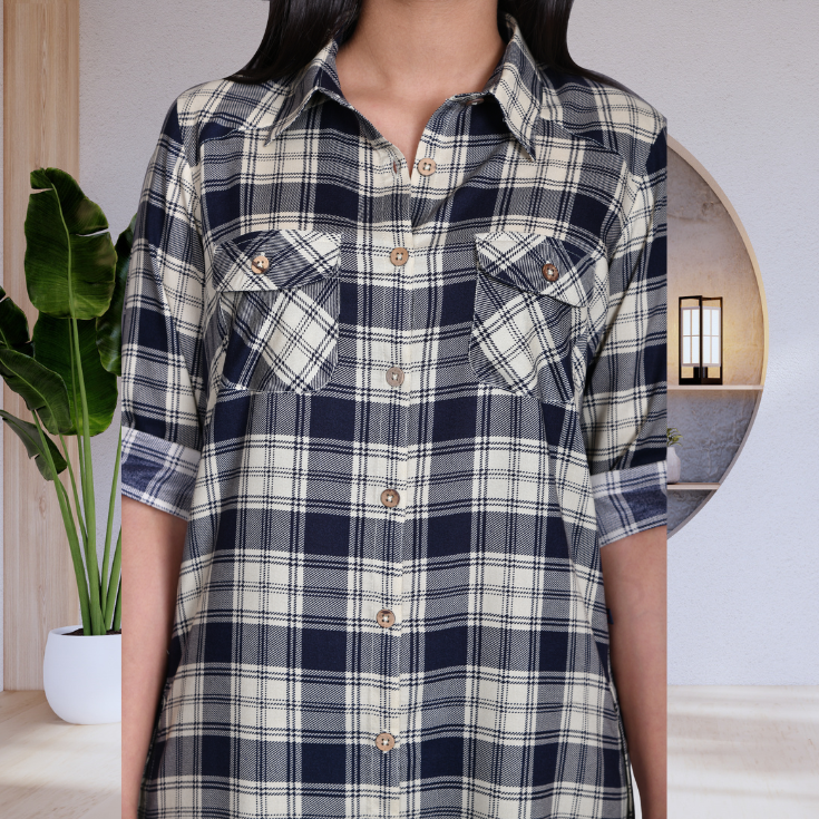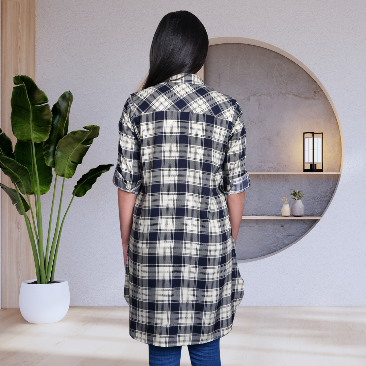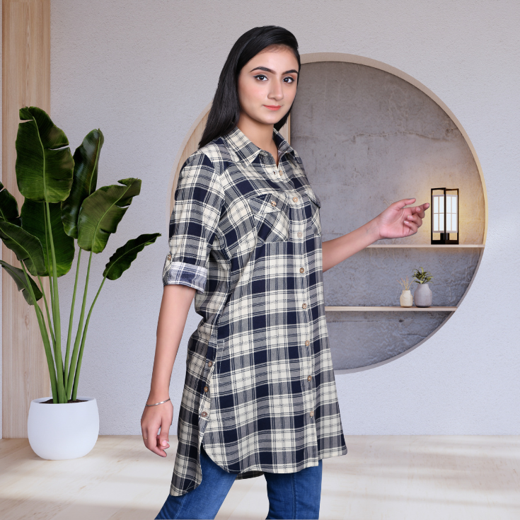 Upgrade your everyday style with this elegant navy blue checkered longline shirt tunic. Designed for comfort and versatility, this shirt features a classic check pattern with a flattering longline fit, making it perfect for both casual outings and office wear.